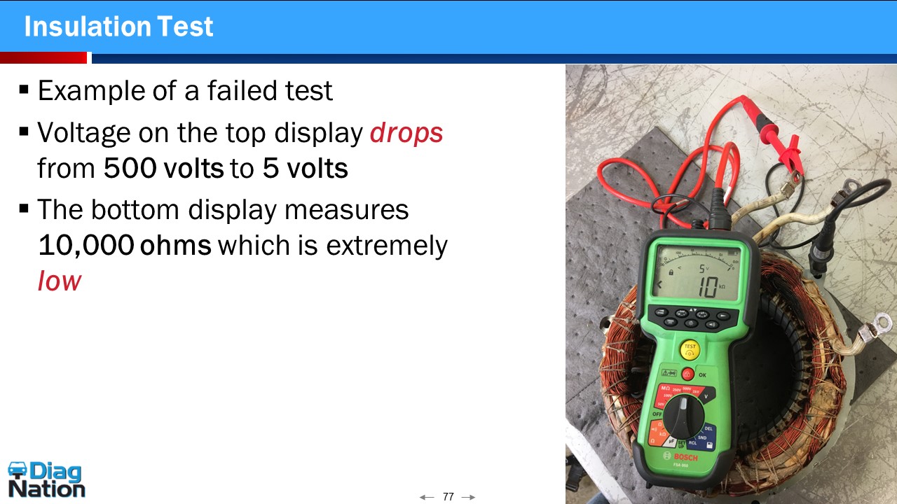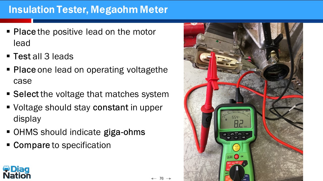 As with the finite, targeted testing that a milliohm test provides for evaluation of the motor assembly, the Megohm tester, or Megger, as we know it, the Insulation Tester built into our high-voltage meters provides a way for a technician to inject a low current, very high-voltage test into any or all of the high-voltage parts, not just the motors.