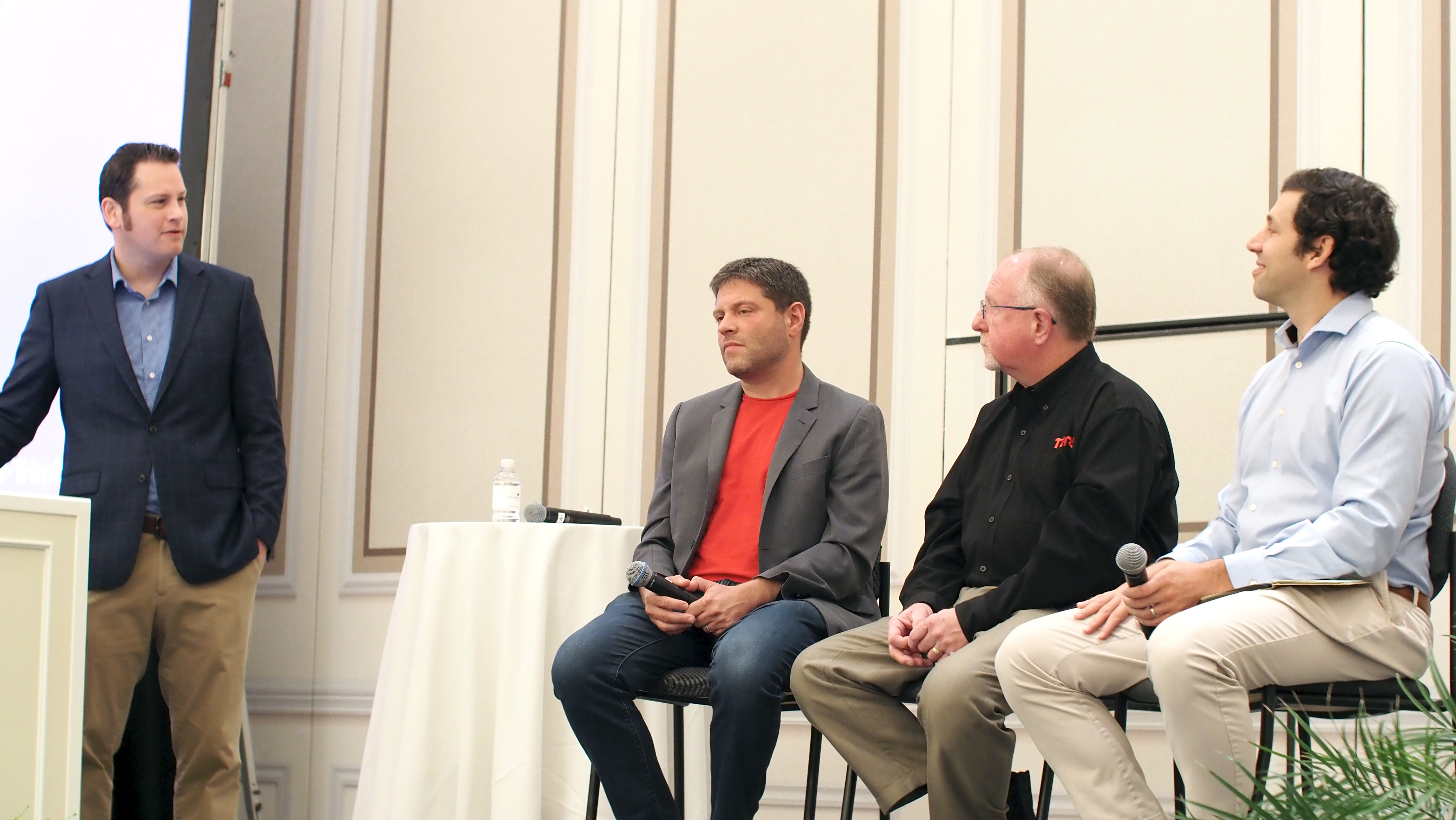 (From left): Seth Clevenger, managing editor for features and multimedia at Transport Topics; Daniel Goff, director of external affairs at Kodiak Robotics; Frank Mabry, a senior analyst for corporate strategy at Torc Robotics; and Andrew Forman, a vice president of the Verticalized Software, Data & Analytics investment banking group at TD Cowen (photo by Aaron Marsh).