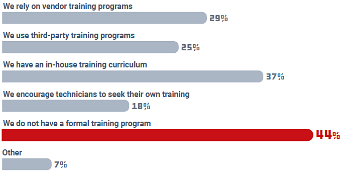 The responses for this question indicate the challenges the industry is facing: 44% of shops don’t have a formal training program, but it’s only a short hop to the 37% that have an in-house curriculum.