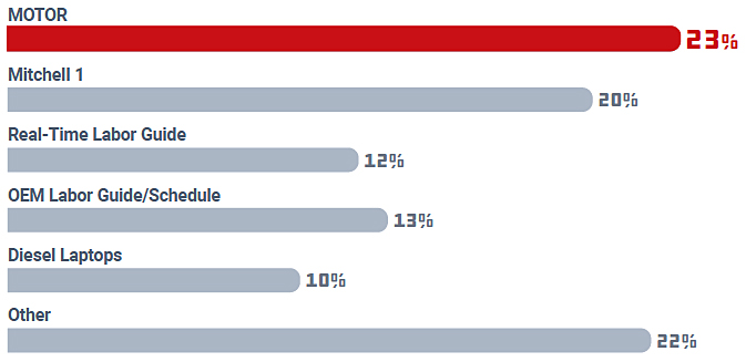 SRTs can offer a host of benefits to repair shops: they provide industry-standard guidelines, but they’re also useful training aids and refreshers. Report data says that MOTOR has a slight edge over Mitchell 1 (23% to 20%) as far as market size, but the survey also noticed that 22% of respondents are using “Other.”