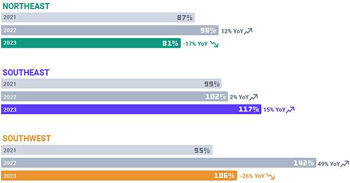 Data, data, from the app, where are the most efficient diesel techs at? The Southeast is home to the most efficient diesel techs (117%). This number was driven in large part by a higher number of labor hours.