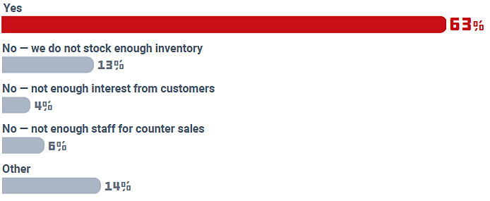 Some shops add to their revenue by selling parts over the counter with no labor attached to them. Sixty-three percent of shops offer this service; 13% might be interested but lack the inventory to do so.